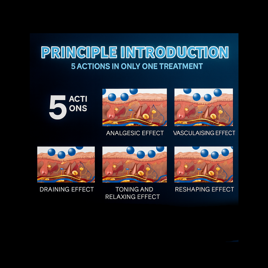 The Inner Ball Roller Technology delivers five powerful actions in a single session, combining mechanical stimulation, heat conduction, and intelligent micro-vibration. This multi-dimensional approach targets both surface and deep tissue layers, ensuring visible and lasting results for the face and body. The treatment provides an analgesic effect by relieving muscle tension and reducing discomfort, while the vascularising effect enhances microcirculation and oxygen supply to the skin. The draining effect activates the lymphatic system to eliminate toxins and excess fluids, helping to reduce swelling and puffiness. Through the toning and relaxing effect, muscles are gently stimulated and reshaped, improving firmness and contour. Finally, the reshaping effect breaks down stubborn fat clusters and smooths cellulite, leaving the skin tighter, smoother, and more refined. Together, these five synergistic actions make the Inner Ball Roller one of the most comprehensive non-invasive body and face contouring technologies available today.