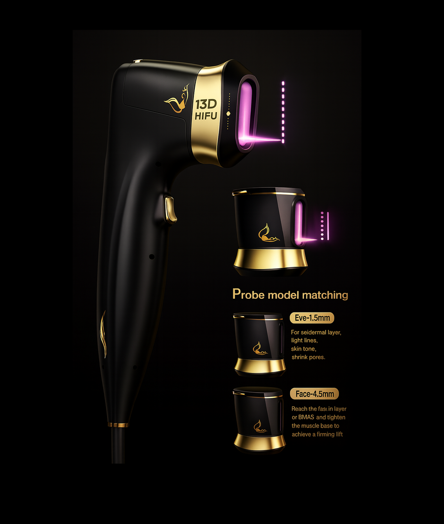 • The 13D HIFU handle focuses on facial rejuvenation. It delivers energy through 13 lines or points per shot, reaching skin depths of 1.5mm, 3.0mm, and 4.5mm (with optional 6.0–16.0mm probes).