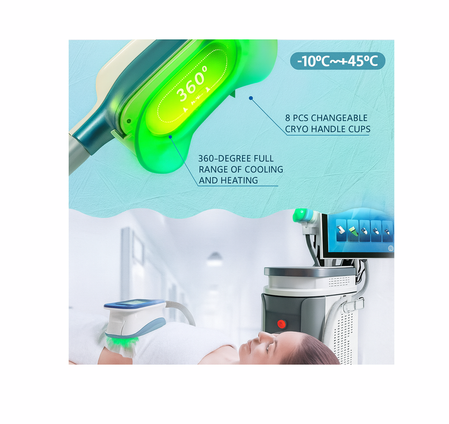It is a full-range cooling and heating system that works evenly from all angles. The device offers temperatures from –10°C to +45°C, allowing both deep cooling and controlled heating. The system includes 4 cycle modes for flexible operation, and all parameters can be adjusted individually. With 8 interchangeable cryo handle cups, different sizes are available to match various treatment areas and body shapes.