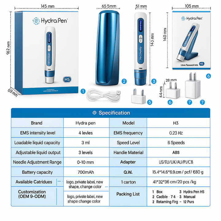 With four adjustable EMS intensity levels, the treatment can be customized for all skin types and sensitivity levels. The built-in 700mAh rechargeable battery ensures cordless convenience, while the 0.25mm microneedle system promotes deeper absorption of active skincare ingredients for visibly improved results.