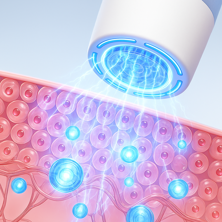 The circular multi-polar current penetrates deeply into the epidermis, dermis, and fascia, stimulating cellular activity and promoting natural collagen synthesis for visibly firmer, smoother skin.